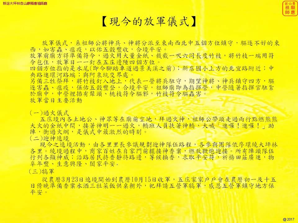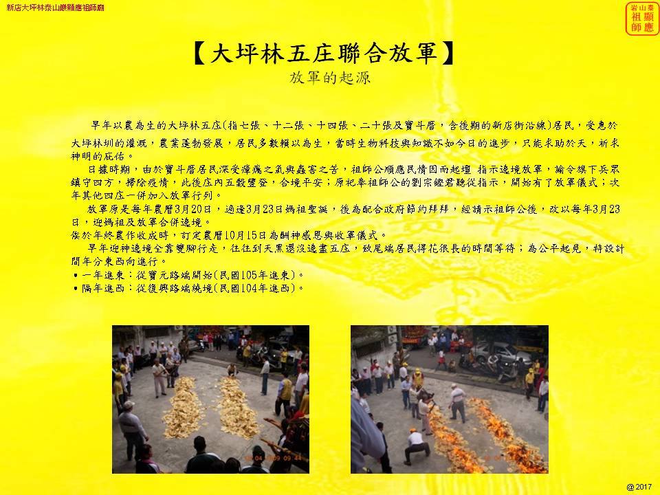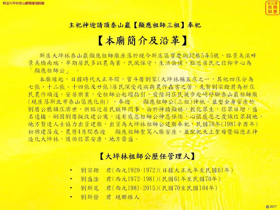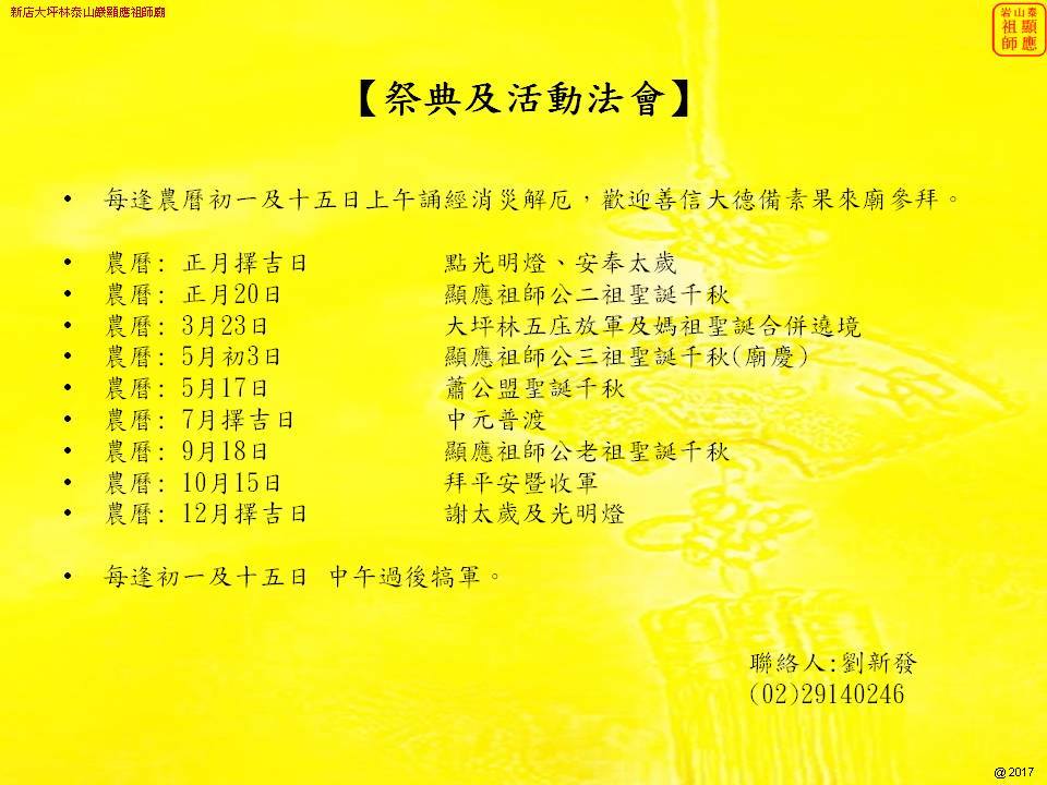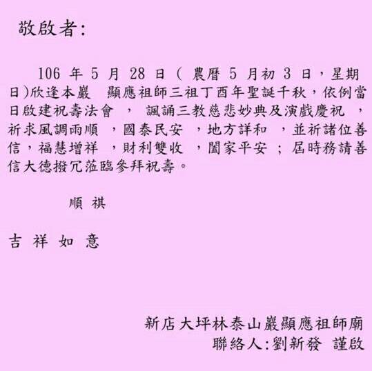 敬愛的宗親們: 我們的宗親一直都是顯應祖師廟的管理人,茲將5月28日(日)顯應祖師公三祖聖誔千秋活動,提供給大家參考。 5月28日(日)當天下午有歌仔戲,晚上有辦桌,如有興趣參加辦桌的宗親,請在5月25日(四)下班前與 本宗親會連繫,以便協助安排位子,謝謝。