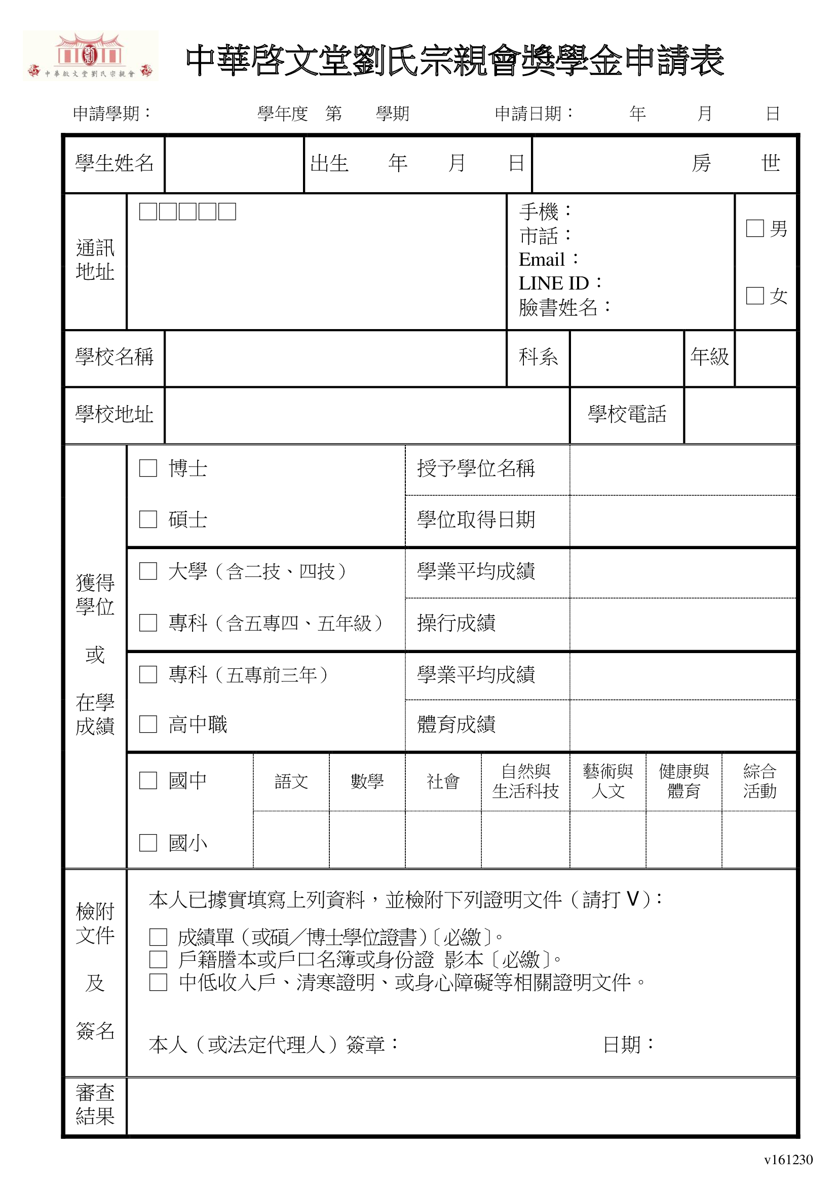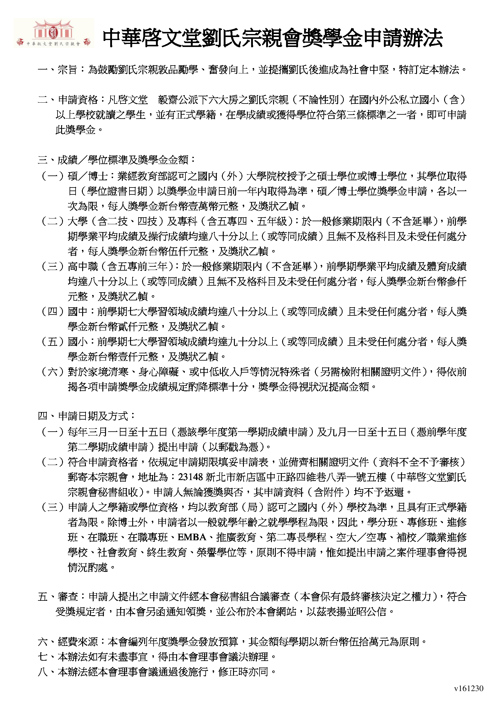 宗親會奬學金之申請,開放期間訂於每年的3月、及9月,欲申請者,敬請備好所需証明文件並郵寄至秘書處,茲附上申請辦法及申請表格,請參考,謝謝!