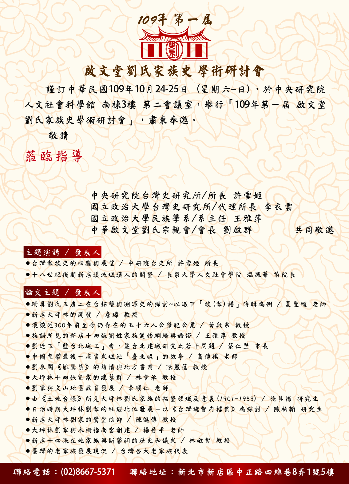 宗親會訂於10月24~25日,與中央研究院合作舉辦「第一屆啟文堂劉氏家族史 學術研討會」,茲附上會議資訊如下: